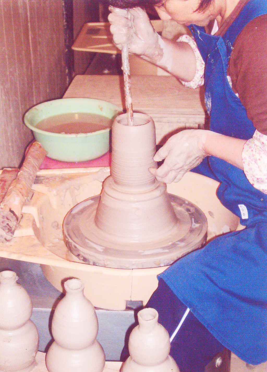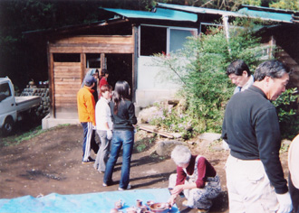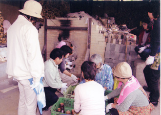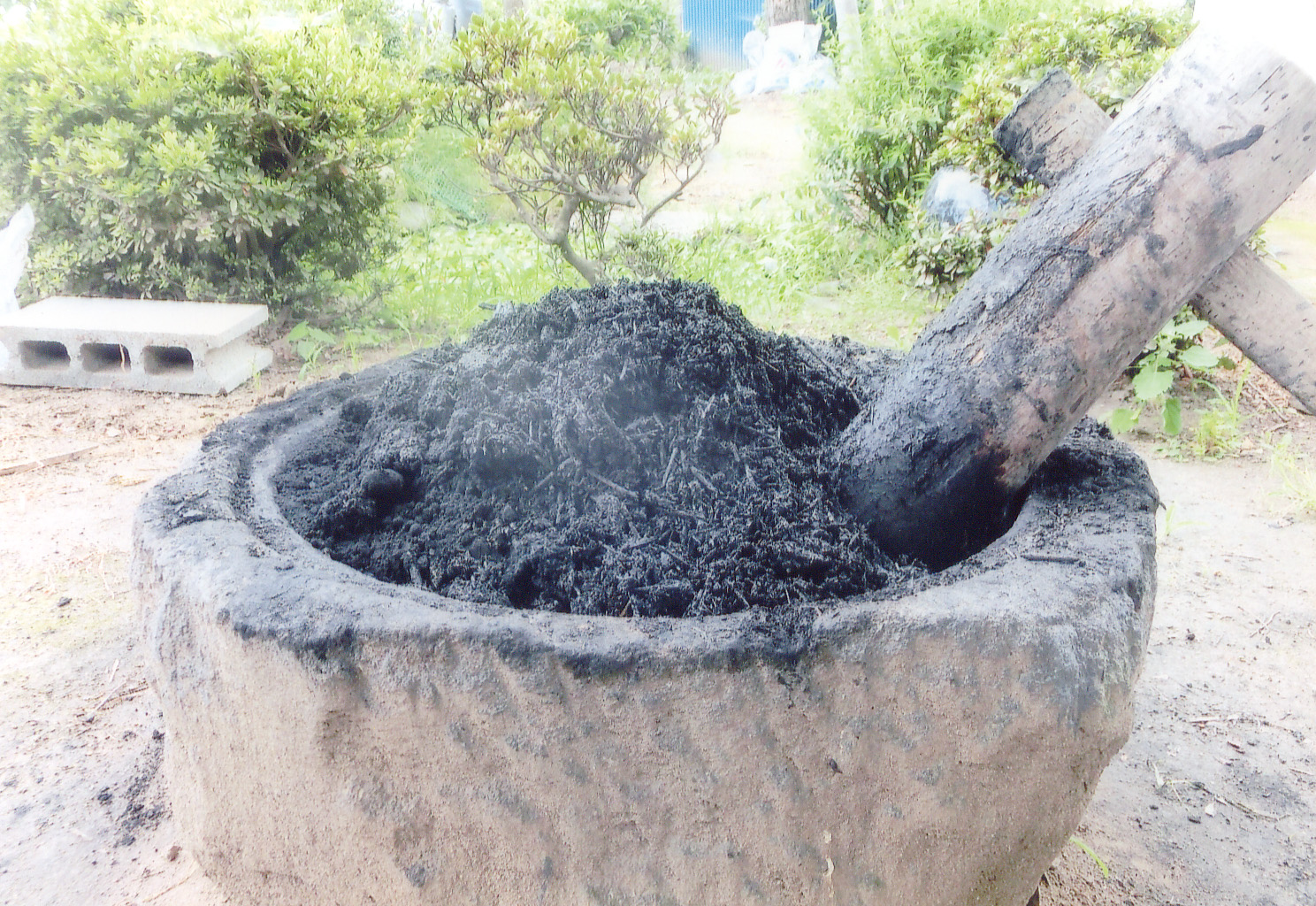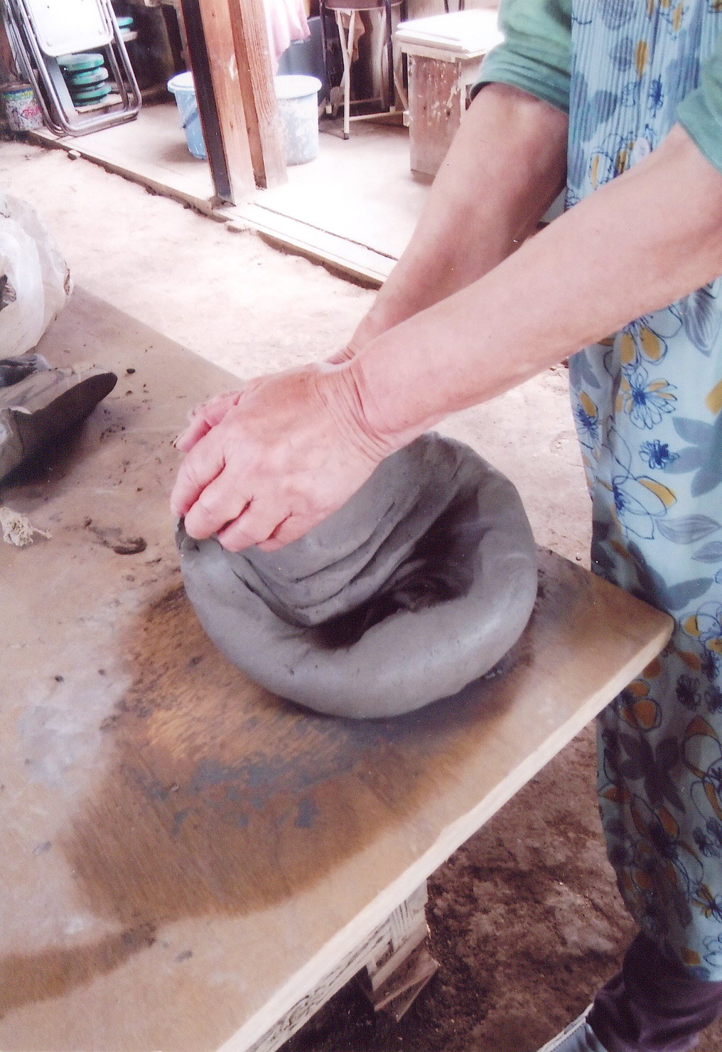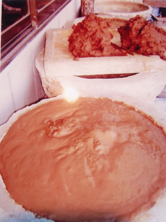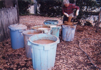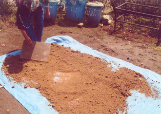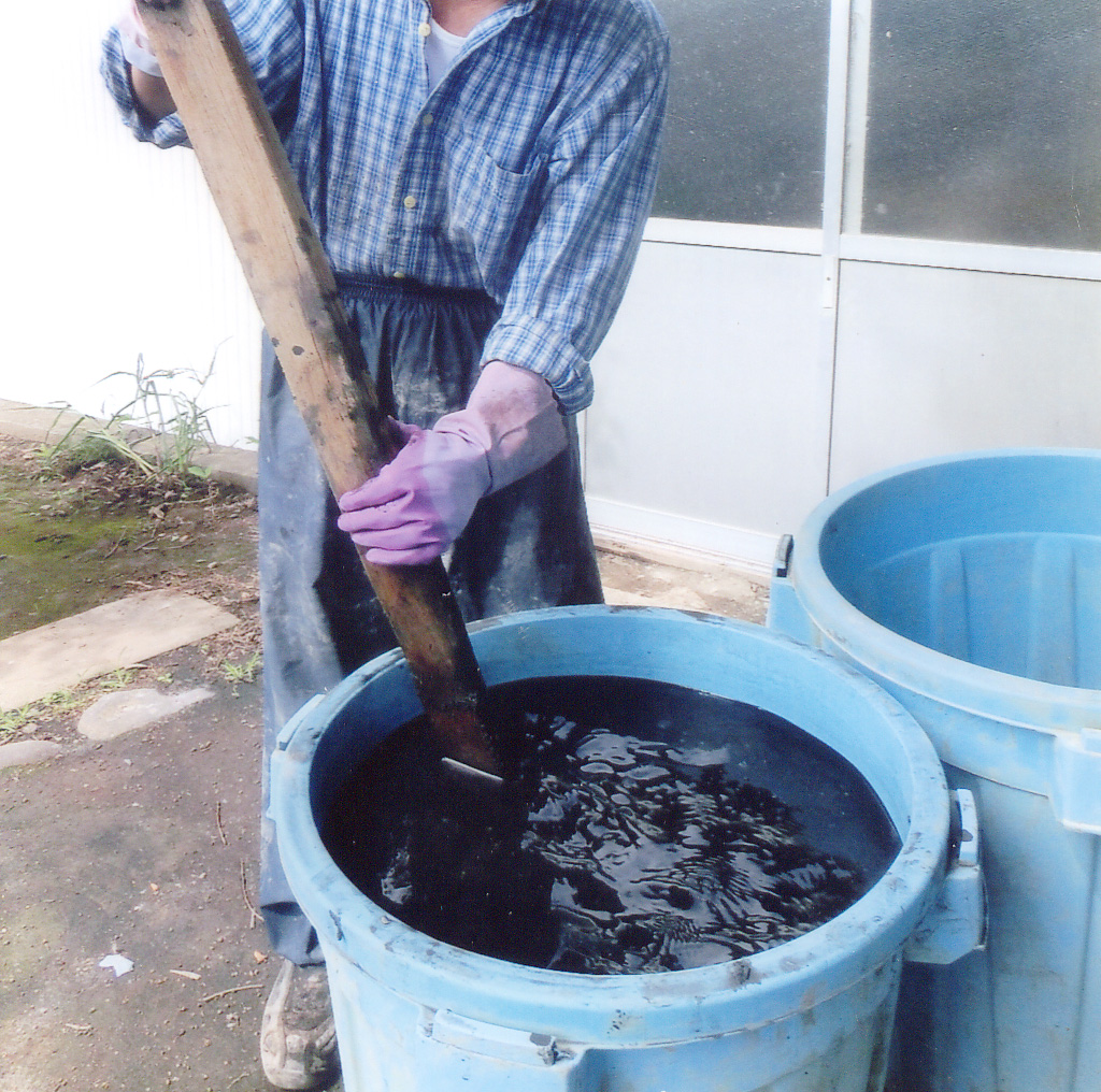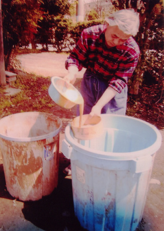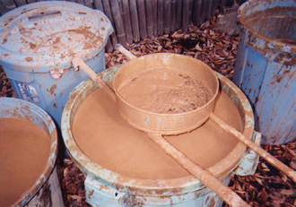 | 粘土質の採掘 | 天日干し | 桶に入れて撹拌 |